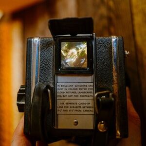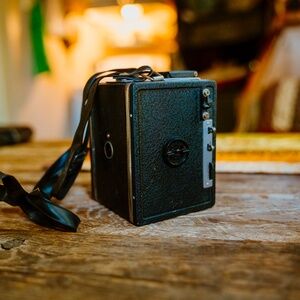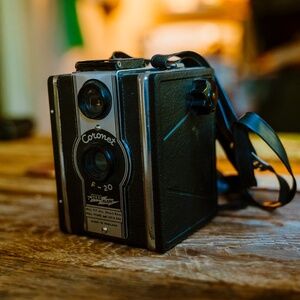 The F-20 Coro-Flash by Coronet is a simple camera made of metal for 6x6 cm exposures. It has a centered viewfinder window and a small folding hood that gives it a pseudo twin lens reflex styling. accept either 120 or 620 film sizes. Produced after the main Art Deco period.