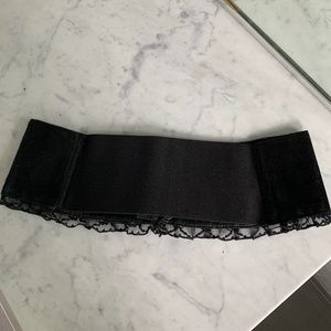 Super feminine corset style belt with lace trim - black suede with velcro opening at side, back is elastic so very adjustable. no brand name. see pictures for measurements.