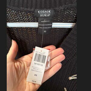 This black knit cardigan is decorated with embroidered, appliquéd patches on the chest and sleeves, showing crescent moons, skulls, mushrooms, suns, moths and mystical hands. The buttons are silver-toned skull shapes (comes with extra button).