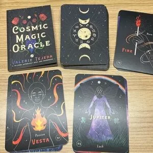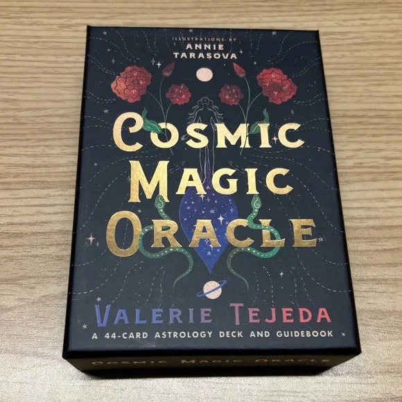Cosmic Magic Oracle deck with vibrant illustrations. Features a mystical design with red and gold accents.