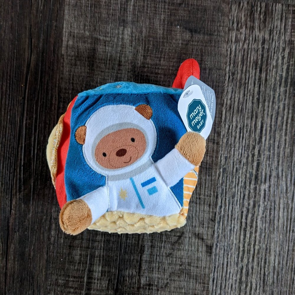 4" × 4″ Space is a hot topic right now, with talk of Mars, the moon, and beyond. Sweet, soft, and full of adventure, the perfect gift for boys and girls. This is a busy block sure to stimulate babies. Sun, moon, and stars combine to help parents create fun bedtime stories. Features rattle, crinkle sound, fun colors, and stimulating textures.