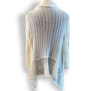 Perfect for achieving a layered look, this crochet open cardigan creates a leveled effect with long side tails and a cascading drape. Cinch it with a belt to add a tapered touch.