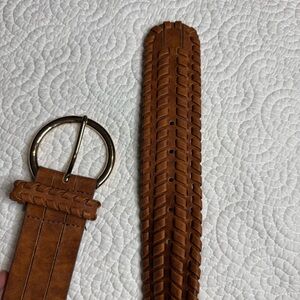 Stylish woven brown belt. Features a sleek silver buckle. Perfect for any outfit.