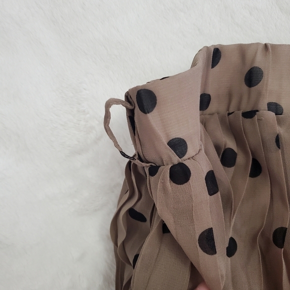 A beautiful taupe/mocha brown pleated skirt covered in classic black polka dots. The lightweight, flowy material creates lovely movement with every step. Features a comfortable waistband with a cute decorative tie detail on the side. It's fully lined, so you can wear it with confidence!