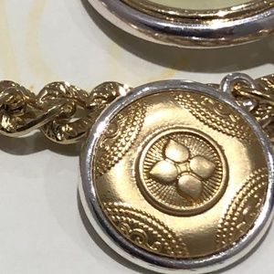 BCBG Chain medallion necklace and Hudson’s Bay multi pearl size multi strand substantial necklace. The medallion one reaches below bra. The other much shorter, fills around base of neck. Not used. No tarnish, like new. Party wear perhaps!