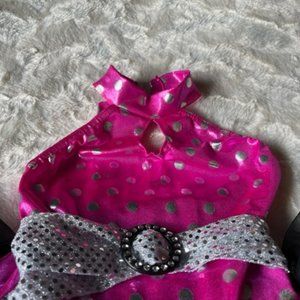 Costume Gallery Fuchsia and Black Dance Costume with Tutu in very good use condition, only worn once for recital. Child Size Med. Bodice is fuchsia with polka dots and belt at waistband. Tutu is 3 layers with silver sequins. Dry clean only. Made in USA. We do pack our items with care; however, tutu will require steaming. Colour depends on device/screen settings and lighting in pictures. All measurements are approximate and may slightly vary. Measurements are taken by hand with item laying flat and unstretched. All items are from my smoke free home.