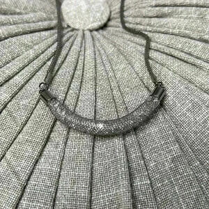 Elevate your style with our exquisite costume jewelry featuring a stunning thick 17-18 inch chain. The centerpiece showcases a captivating mesh half-moon design adorned with sparkling crystal-like gems, adding a touch of glamour to any ensemble. This statement piece beautifully complements a little black dress or a chic top, effortlessly transforming your outfit for any occasion.