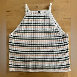 This H&M tank top features a ribbed texture and a cropped fit, perfect for a casual yet stylish look. The white and pink color combination adds a fresh touch, while the tank top style ensures comfort and versatility for everyday wear.