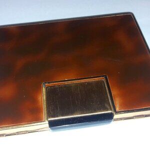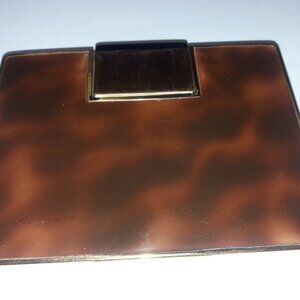 I also don't know if this piece's brown exterior is made of enamel, bakelite, anther early plastic, or something else entirely. Regardless, it's a sturdy faux tortoiseshell that has held up beautifully. It is slightly worn at one upper corner on the front. Otherwise, I see no wear or damage to it at all.