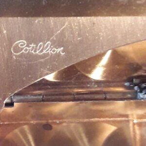 This vintage Cotillion cigarette case.is a bit of a mystery. I can't find any other evidence of the Cotillion company's existence or anything else it ever made. (It doesn't help when I'm searching that "cotillion" is a common noun.)