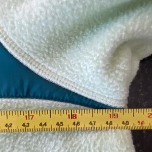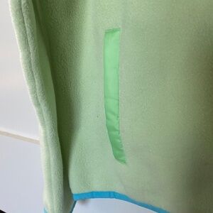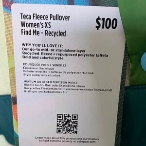 Selling rare Cotopaxi Teca 1/4 Snap Fleece lightweight pullover or mid layer: - colour(s): 'Find Me' (limited edition), retro-look with mint green, teal, and turquoise trim (see photos) - size: XS Womens' (as per size label), see photos & measurements: - chest approx. 19 in from armpit to armpit laying flat; back length from collar to hem approx. 23.5 in - material: 100% recycled polyester, repurposed taffeta chest stripe - centre front snap opening - frontal Kangaroo style hand pockets (see photos) - long sleeves, elastic binding hem and cuffs - new with tags (see photos), ordered online and tried on once at home - too small for me. - retails for C$134.99 - from clean, smoke-free home
