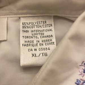 Vintage Tabi button down short sleeve shirt with embroidered lavender & pink thistles on collar and front. Hidden buttons. Very sweet cottage core style. XL Single needle tailoring 65% polyester 35% cotton Very good, gently used condition with no flaws. 🌼 Items are cleaned or steamed before shipping. 🌼 Make an offer! Bundle and save! Bundle 2 items or more to receive a private offer! 🌼 Want to open a Poshmark Canada account? Sign up with my code - @shawnawillems - and receive $15 off your first Poshmark Canada purchase ($20 or higher)