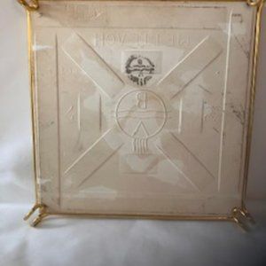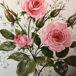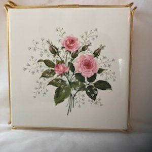 Cottage Core Vintage Porcelain Pink Rose Trivet Banded in Gold Metal Two small flea bites at corners - barely visible Gold Metal Banding Intact Square Shaped 6. 5" x 6. 5" Some markings on back commensurate with age Vintage Item Very Pretty Piece