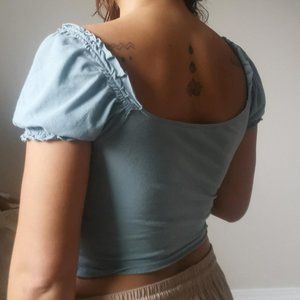 On or off shoulder baby blue peasant top with heart neckline. Flattering scrunch detailing