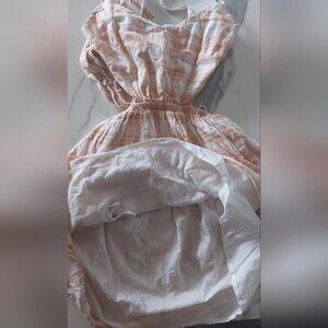 Size Small, full lined, backless, upper from linen and viscose materials, lining 100% cotton, elastic waist, 2 side pockets, soft cream and pink colors.