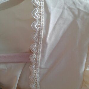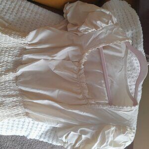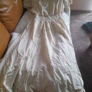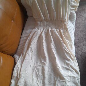 A lovely cream-coloured mid length summer dress, lightweight, with ruffle detailing on cuffed sleeves and hem, adorable heart stitching to a square neckline, fits a size 1xl and 2xl comfortably