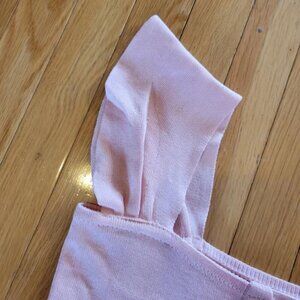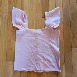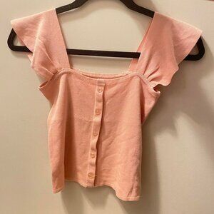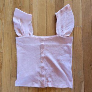 This adorable coquette-style knit top features a beautiful coral pink hue and a flattering cropped fit. The ruffle butterfly sleeves add a feminine touch, making it perfect for a soft, romantic look. The faux front button-up detail enhances its vintage charm. The knit fabric allows for some stretch, ensuring a comfortable fit.