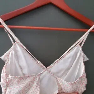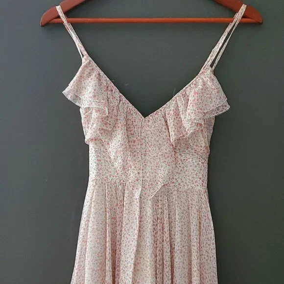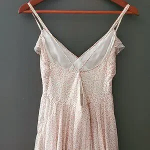 Sweet, and airy cottage-core mini dress with a darling tiny pink flower print with criss-crossed spaghetti straps. Like new condition.