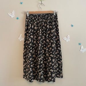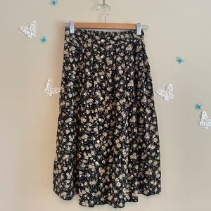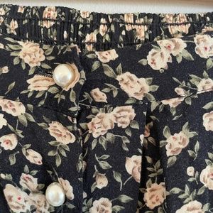 Mid length skirt, button up front with big pearl buttons, elastic waistband, rose pattern on black
