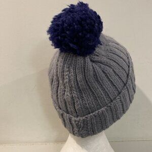 Women's Cottle grey loose ribbed knit cap hat beanie with Blue pom-pom