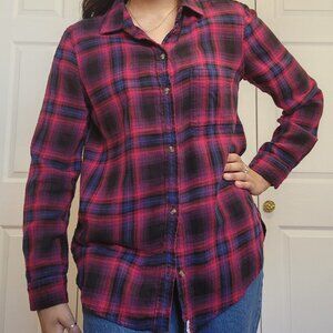 American Eagle "Ahh-Mazingly Soft" boyfriend fit flannel. Magenta, indigo, black button-up. Super soft and great to wear buttoned up or unbuttoned over a tank. Very good quality. Marked as size medium but can fit more oversized on size small. For reference, model is size S/M.