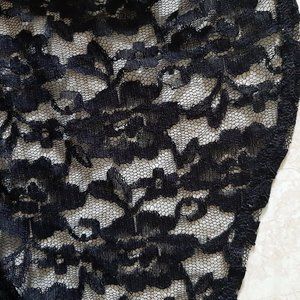Cotton Candy Sheer Black Lace tank top Dressy Medium Zipper in back Beautiful neck and sleeve border. Wash tag was cut off....as this top is not lined and would have shown through! It is in perfect condition. Must wear a bra or camisole/something underneath. Very elegant, dressy, classy -can even be worn for evening fancy events when paired with more formal bottoms and shoes. This lace is not irritating to the skin and feels soft and cool to the touch.