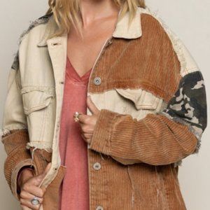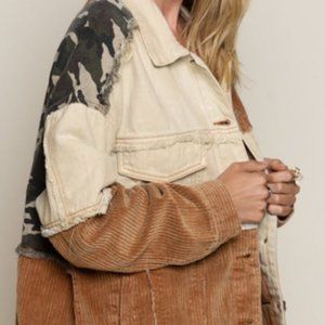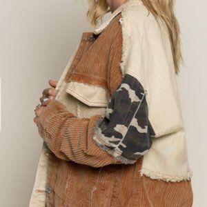 Your outfit isn't complete without our "Forever It'll Stay With You" jacket ! Designed with a relaxed oversized fit with mix fabrication of corduroy , denim and camouflage print that has . been beautifully washed for it to blend well with one another. Comes with button down closure on center front, distressed detailing on the garment, button closure on sleeve placket and finished with bottom band. Lightweight for spring, summer and early fall.