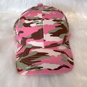 100% cotton denim ladies baseball style cap in a bright camouflage mix of pink, green, brown, and white.