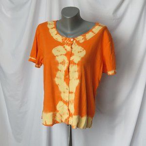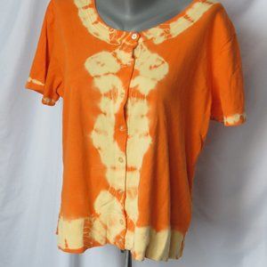 Bright & cheery! This short sleeve cardigan by Cotton Cotton Ginny. In blaze orange with yellow tie dye trim along the edges, this is a very comfy layering piece with a scoop neck and button front. It shows very little signs of wear and is in good condition.