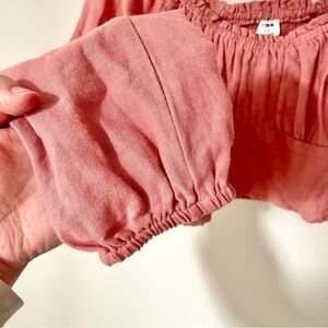 Cotton On Bustier Puff Sleeve Cropped Top Pink Size Small. Made in India cotton blend. Bustier style milkmaid top with smocked back and long puff sleeves. Size small. Excellent condition.