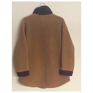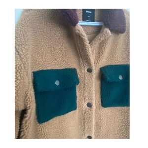 Warm, cozy and stylish curly fleece Teddy shacket. Features tan body, brown collar and dark green chest pockets. Has side pockets and full button down closure. Great for a day at the mall or cozied by the fireplace.