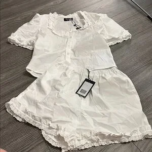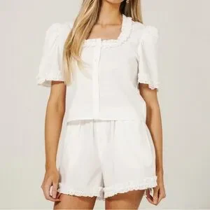 made from 100% crisp cotton, delicate eyelet ruffle along the neckline and arm openings, and classic buttons down the front