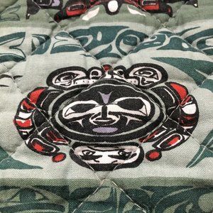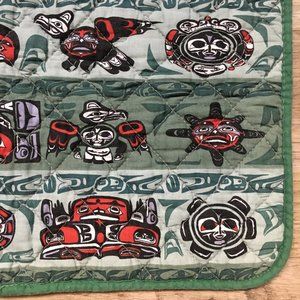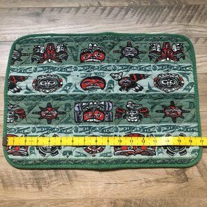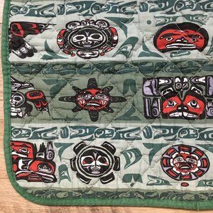 Good preowned condition, quilted placemat, featuring a complimentary scheme of green, mint, red and black Haida illustration by Native Home. Designed in Canada by local artists. Perfect for a side table or if you're looking for a very attractive towel for under a dish drying rack.
