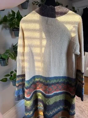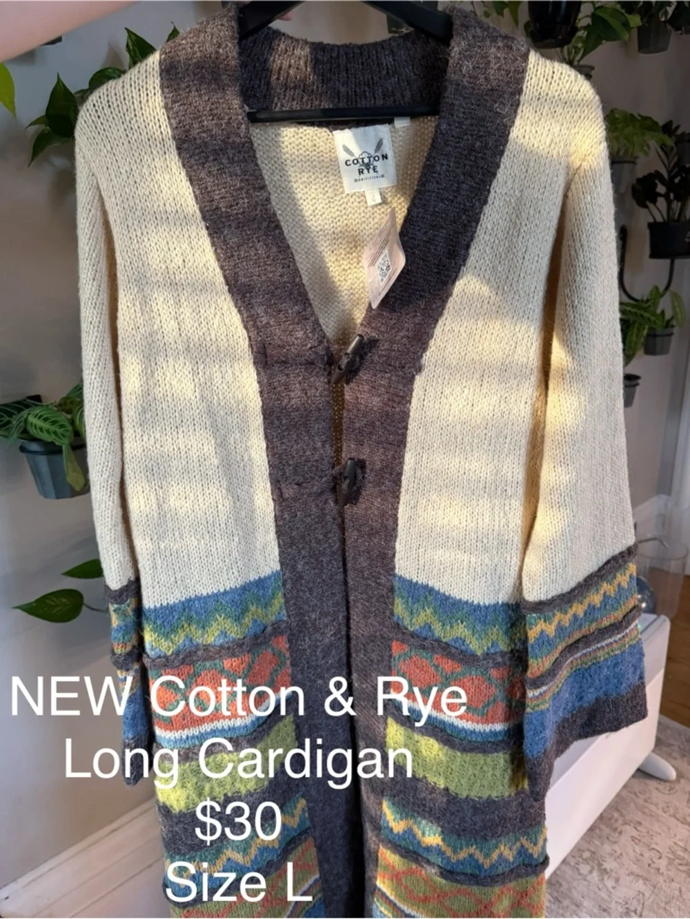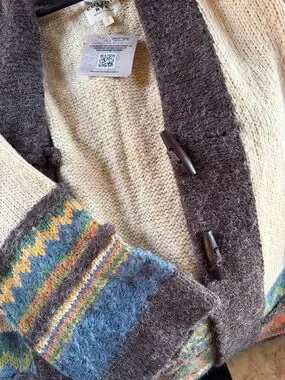 Cotton & Rye cream long cardigan featuring multicolor patterned panels and contrasting charcoal trim. Soft knit construction for comfortable layering. Toggle closures provide a cozy, casual look. Versatile cream and multicolor tones pair well with jeans or leggings.