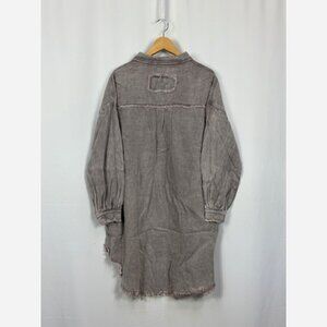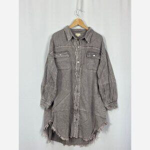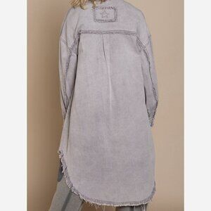 The Cotton Shacket is a boho-inspired layer designed for relaxed, effortless style. Crafted in 100% cotton, it features a button-up front, puckered fringe hem sleeves, and a fringed bottom for added texture. Its oversized silhouette makes it versatile enough to wear over a top or styled on its own.