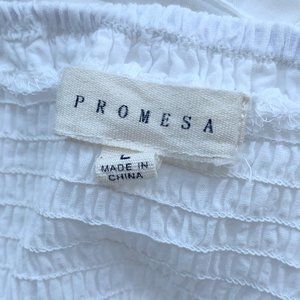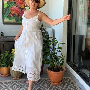 A light and airy knee-length summer dress with a beautiful scalloped embroidered hemline, an open stretched ruched back, and adjustable spaghetti straps, in 100% cotton with 100% rayon lining. Perfect for a Diner en Blanc evening. A snug size large.