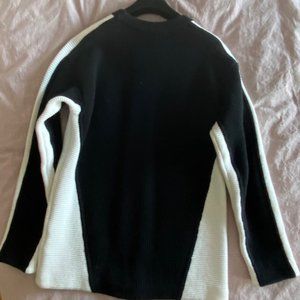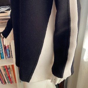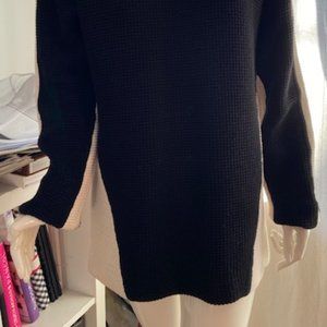 Cotton waffle knit crew neck sweater. Color block Black and White. Slimming colour placement, with white on sides and on sleeves, creates an illusion of slim body.