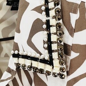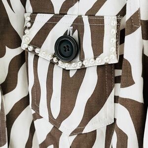 This gorgeous cotton jacket with zebra print and bead embroidery on the collar and pockets will not only protect you on a chilly day, but will also allow you to always look fashionable and stylish!