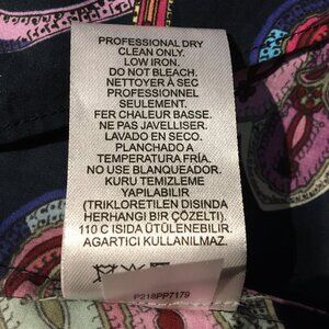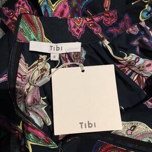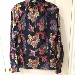 Crisp cotton top by Tibi, size Small, in "Navy Multi" paisley print. Long raglan cut sleeves, high shirred crewneck neckline with back zipper, shirred cuffs. 100% cotton. Dry clean. New, never worn, with tags.
