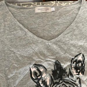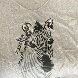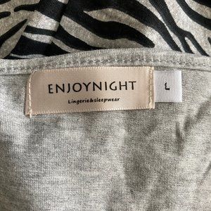 Zebra stripe lightweight 3/4 length pajama pant with elastic waist. Matching Zebra graphic cotton V-neck short-sleeve nightshirt. Enjoynight brand. Size is Large. Still has the tags. Tee is 100% cotton, pants are a 60/40 cotton/poly blend.
