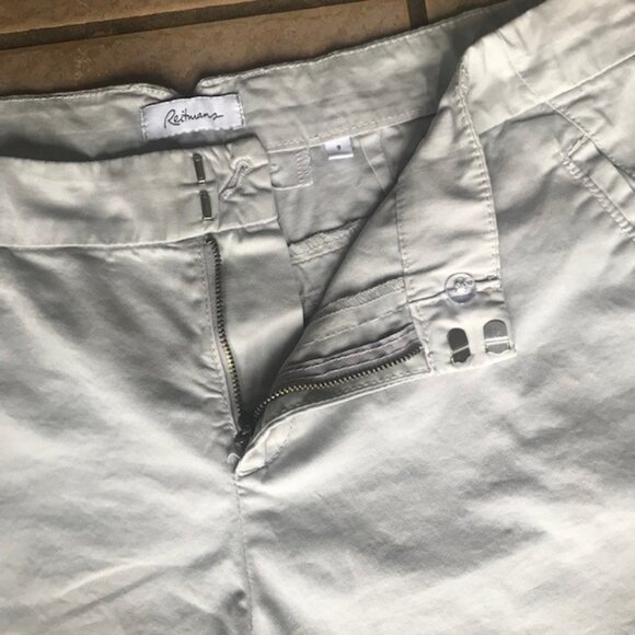 pale grey, good quality cotton fabric, light & dense , zipper & hooks closure, side pockets, straight wide legs , size 9 , which correspond to US 10/L (really L), mid rise , very good condition !