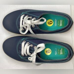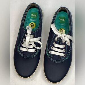 Navy blue with teal stitching. comfy sneaker for gardening/ rainwear or waterfront areas. New condition, no tags