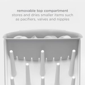 REMOVABLE TOP COMPARTMENT: Stores and dries smaller items such as pacifiers, valves and nipples