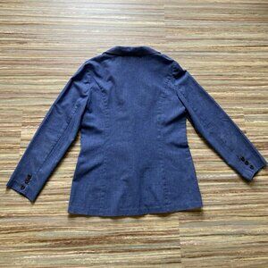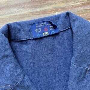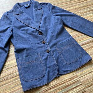 Vintage Country Blues brand lightweight chambray blazer jacket has pockets at hips with western-style stitching. 50% cotton/50% polyester, made in Canada. Machine washable. Tag doesn't list size, fits like a women's medium - see below for garment measurements.