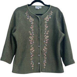Country Collection Vtg Khaki Embroidered Cardigan • M • Boho Grannycore Eclectic