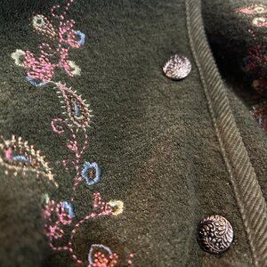 Charming vintage Country Collection cardigan in khaki with detailed paisley and floral embroidery throughout. This versatile piece blends boho, grannycore, and eclectic cabin vibes — perfect for layering in every season.