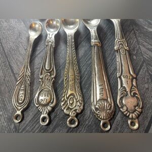 This silver-tone metal measuring spoon set remains in good condition, with some visible tarnishing and signs of wear inherent to its age.