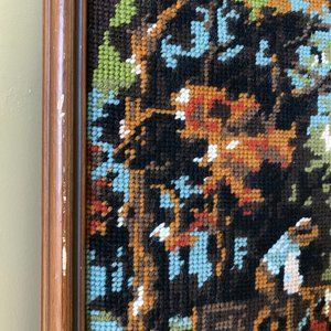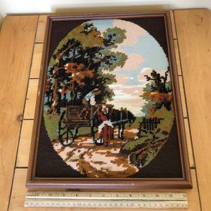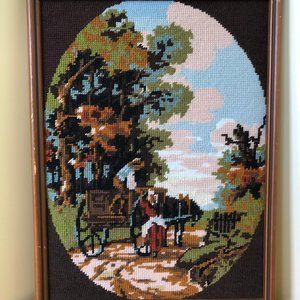 Vintage completed & framed Countryside Horse & Wagon needlepoint embroidery picture. Framed without glass, frame size is 12 1/2" & 16 1/2". Pre-owned completed needlepoint embroidered picture, wood frame has scrapes, scratches, indents, backing paper has a few rips.