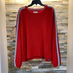 Sleeve stripes add a sporty-chic twist to this soft combed-cotton sweater.
