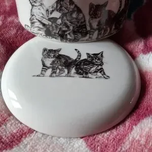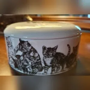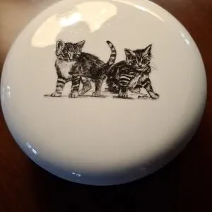 Cheri Lane "Forty Winks" kittens pencil sketch on white porcelain by Steve O'Connell, covered trinket dish.